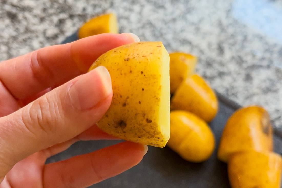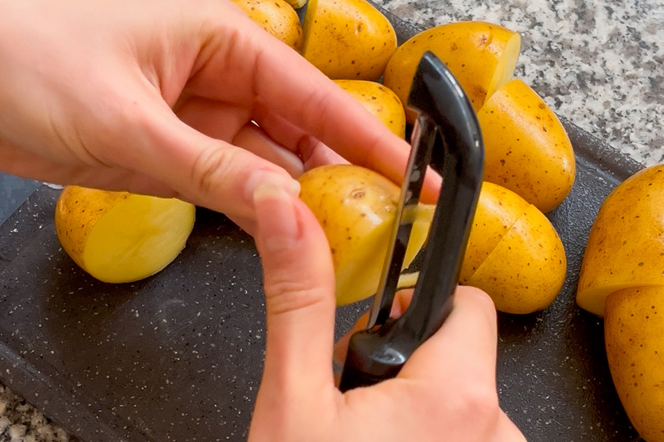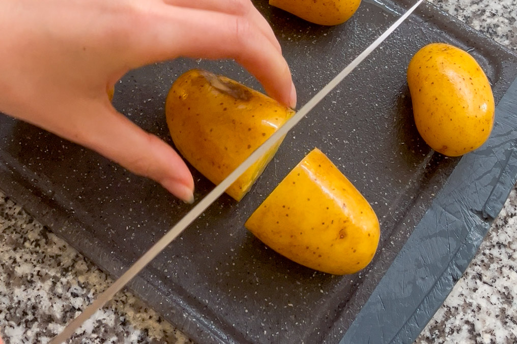 - Wash and halve the new potatoes. Then, using a peeler, round off the edges using the Mentori Technique (see tips section for more detail).