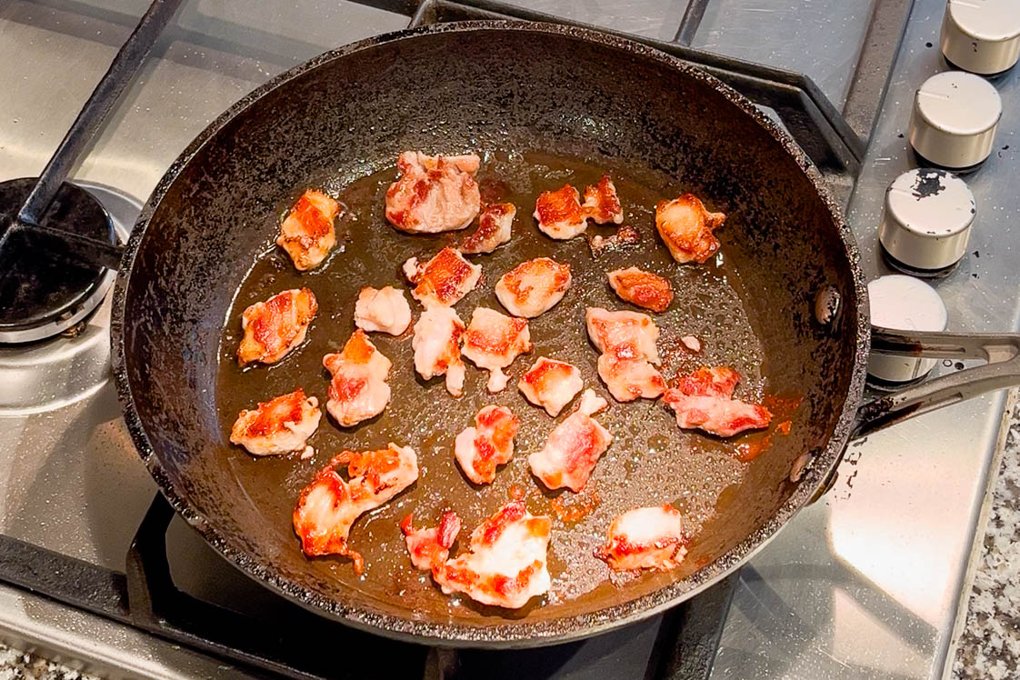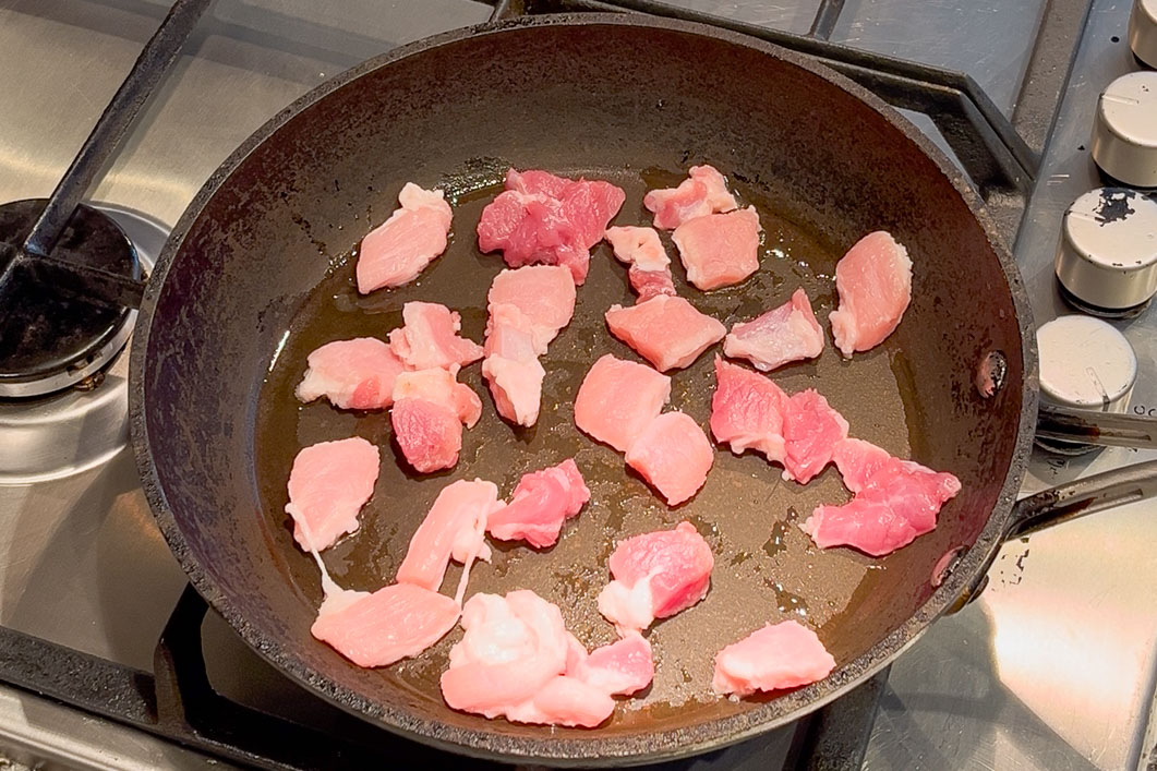- Brown the Pork. Getting a good colour on the pork will give the dish a lot of flavour. Heat the pan on a high heat and when you add the pork, don’t mix it around. Leave it for about 5 minutes (or until a deep golden brown), then flip them to brown the other side.