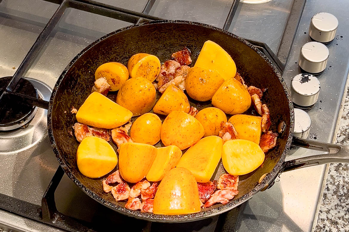 - Once the pork belly has browned, add the potatoes into the pan and stir.