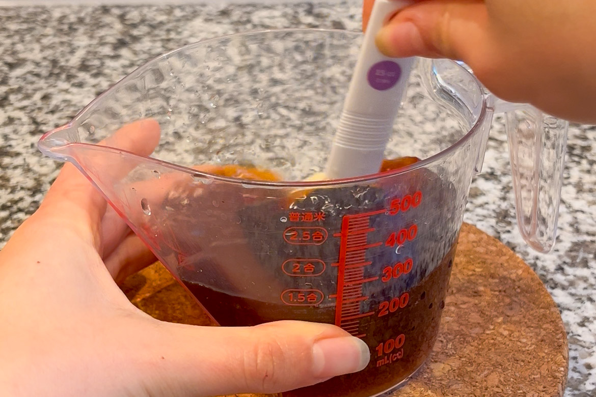 Combine 150 ml water, 1 tbsp mirin, 1 tbsp sake, 2 tbsp soy sauce, and 1.5 tbsp brown sugar. Set aside